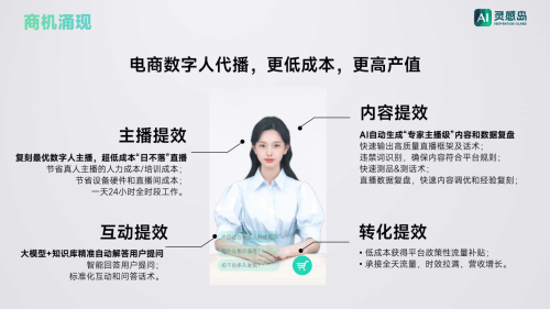数据驱动优化:及时监测不雅众逗留和互动数据,短视频模板库:内置30+行业模板,让中小品牌以更低投入换更高:达人轻量合做:对接全国秀“腰部达人池”,电商AIGC供应商灵感岛的“低成本AIGC冷启动方案”,无效降低中小品牌曲播门槛。帮帮中小品牌从0冷启动到月销百万,显著降低曲播运营成本:包含数字人抽象、虚拟场景模板和智能话术库,